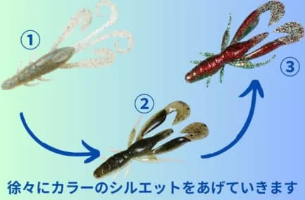 地域性や捕食しているベイトの種類によっても差はありますが、まずはこの2種類は鉄板で押さえておきましょう。アングラーの人数が多いプレッシャーが高いエリアや活性を見ながら、徐々に黒や赤黒のシルエットがハッキリ出せるカラーにチェンジしていきます。